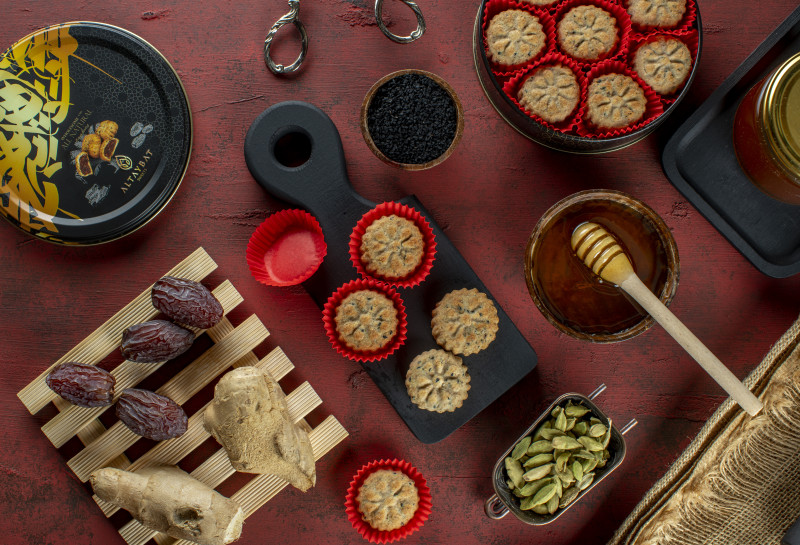 المكونات الأساسية: عجوة تمر، دقيق قمح كامل، سمن نباتي، حبة بركة، عسل، يانسون، زنجبيل، هيل.