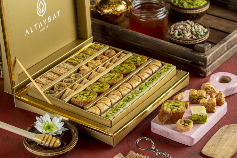 أصناف متنوعة من الحلو العربي (بقلاوة)، مصنوعة من رقائق العجين أو الكنافة، محشوة بالفستق الحلبي الفاخر أو الكاجو، محلاة بالعسل.